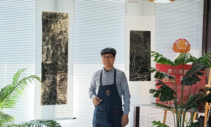 熊亮在孺子书房八大山人梅湖景区分馆自己的画作前。