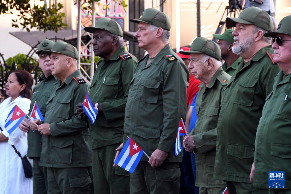 4月16日,在古巴首都哈瓦那,古共中央第一书记、古巴国家主席迪亚斯-卡内尔(右四)出席纪念集会。新华社发(华金·埃尔南德斯摄)