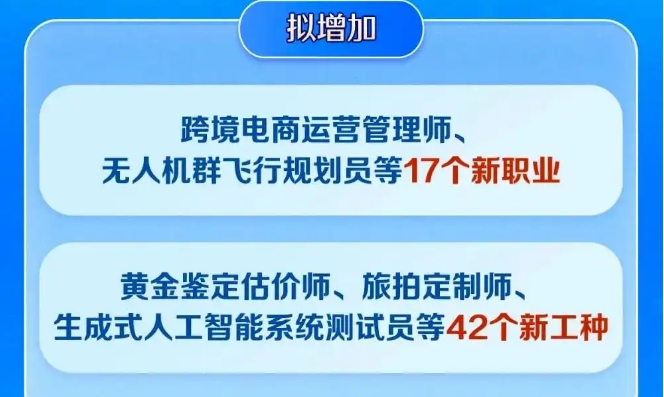 近日,人社部宣布拟新增跨境电商运营管理师、无人机群飞行规划员等17个新职业,以及生成式人工智能系统测试员、睡眠健康管理师等42个新工种。这些新职业、新工种既是产业变革的缩影,也是对社会高质量发展需求的生动回应。新职业持续涌现,开启了时代创造的无限可能。面对职业选择,不少年轻人主动拥抱变化,抓住新赛道。