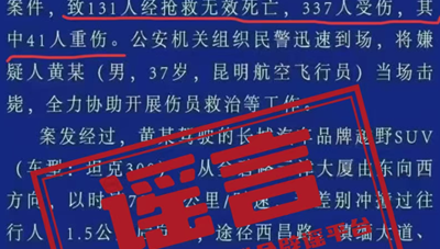 近日,有网民散布虚假的“警情通报”,造谣传播云南昆明交通事故“致131人死亡,337人受伤”等不实信息,公安机关核查后,依法对造谣者进行了刑事拘留。“蓝底白字”的“警情通报”是公安机关权威发布的重要渠道。不法分子竟敢冒用官方标识,将“2死9伤”恶意篡改成“131人死亡、337人受伤”,并编造耸人听闻的细节,真是胆大包天!