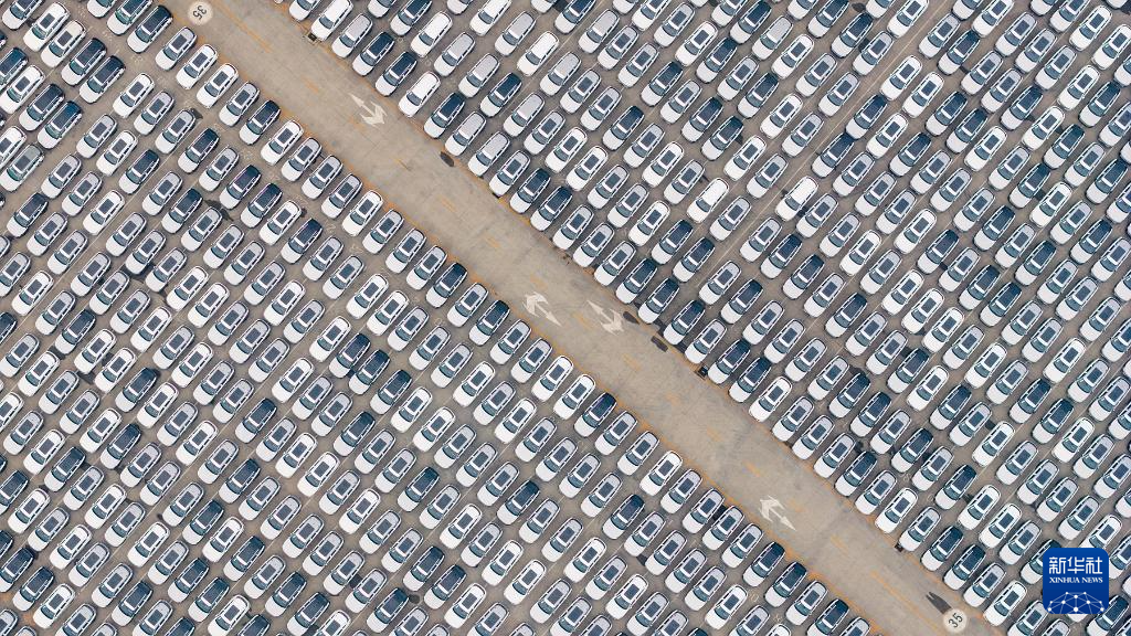 这是4月10日在天津港海嘉滚装码头拍摄的准备装船的国产汽车(无人机照片)。新华社发(杜鹏辉 摄)